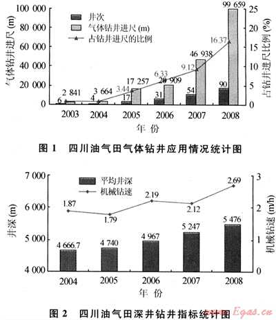 四川油氣田巖石可鉆性差,鉆井速度慢,“十五”期間平均機(jī)械鉆速為2.35m/h,深井、超深井平均機(jī)械鉆速為1.87m/h;此外,井漏頻繁、惡性井漏時(shí)有發(fā)生,2005年川渝地區(qū)井漏各種材料89992m3,因堵漏損失鉆井周期15.1臺(tái)月,井漏占復(fù)雜時(shí)率的60%;再就是低孔、低滲、低壓及水敏性油氣藏,鉆井過程中鉆井液往往造成儲(chǔ)層不可逆轉(zhuǎn)的傷害,造成油氣資源及勘探開發(fā)成本浪費(fèi),也嚴(yán)重地制約了勘探開發(fā)的進(jìn)程[1]。針對(duì)以上難點(diǎn),研究并試驗(yàn)了氣體鉆井技術(shù),該技術(shù)已成為解決井漏、及時(shí)發(fā)現(xiàn)和保護(hù)油氣層及大幅度提高機(jī)械鉆速的關(guān)鍵技術(shù)。目前,四川油氣田氣體鉆井技術(shù)的應(yīng)用規(guī)模逐漸加大,氣體鉆井進(jìn)尺比例逐年增加(圖1),深井、超深井整體機(jī)械鉆速大幅度提升(圖2),鉆井周期大幅降低,并形成了一套適合四川油氣田地質(zhì)特點(diǎn)的氣體鉆井系列技術(shù)。