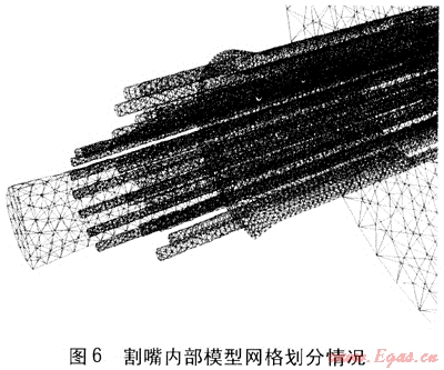 本文應用CFD軟件對割嘴內(nèi)外圈氧氣與丙烷的流動和燃燒做了冷態(tài)、熱態(tài)模擬。模擬計算的模型包括割嘴內(nèi)部氣體流場和割嘴外部空間氣體流場兩部分,因為割嘴是中心對稱的,所以只模擬整個割嘴的一半??傮w幾何模型見圖3,其中割嘴外部空間是直徑為200mm,長度為1600mm的半圓柱體。割嘴內(nèi)部模型見圖4,包括高壓切割氧孔道、內(nèi)外圈預熱氧孔道、燃氣孔道。三維網(wǎng)格劃分情況見圖5、6,其中圖6是圖5的局部放大圖。
