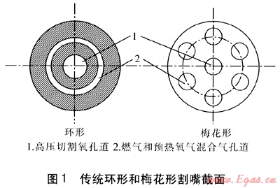 氧氣在切割中主要有兩個作用:①作預熱火焰的助燃氣體,這部分氧氣稱為預熱氧;②使金屬燃燒并將燃燒生成的熔渣排除,這部分氧氣稱為高壓切割氧。傳統(tǒng)切割用割炬的割嘴形式主要有環(huán)形和梅花形兩種[1]。環(huán)形割嘴主要由內(nèi)嘴和外嘴兩部分組合而成,又稱組合式割嘴。梅花形割嘴與環(huán)形不同,燃氣和預熱氧的混合氣孔道呈小圓孔,均勻地分布在高壓切割氧孔道周圍,整個割嘴為一體,又稱整體式割嘴。傳統(tǒng)環(huán)形和梅花形割嘴截面見圖1。