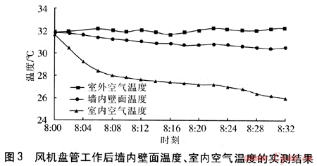 2006年8月7日對(duì)風(fēng)機(jī)盤管工作后墻內(nèi)壁面溫度、室內(nèi)空氣溫度的實(shí)測(cè)結(jié)果見(jiàn)圖3。由圖3可知,墻內(nèi)壁面實(shí)測(cè)初始溫度為31.8℃,實(shí)測(cè)室內(nèi)初始空氣溫度為31.6℃。隨著風(fēng)機(jī)盤管的開(kāi)啟,墻內(nèi)壁面溫度平緩下降,30min后降至30.5℃,由于時(shí)間較短,可以近似認(rèn)為墻內(nèi)壁面溫度保持不變。風(fēng)機(jī)盤管工作30min后,室內(nèi)空氣溫度由31.6℃降至26℃,風(fēng)機(jī)盤管工作時(shí)間與計(jì)算結(jié)果(18~23min)相差不大。