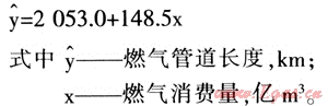 管道長度的增加是管網(wǎng)改造的主要成本之一,只有用管線總長度最小的管網(wǎng)銷售最大的用氣量,才能得到最高的系統(tǒng)利用效率。北京市天然氣用量近年來增長很大,負(fù)荷的增加與管網(wǎng)建設(shè)存在一定關(guān)聯(lián),通過對1995年—2008年間北京市天然氣管線長度與天然氣消費量的變化進行分析,得出如下的回歸方程: