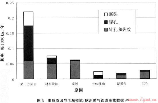 實踐證明,管網(wǎng)長期低壓運行,一旦升高管網(wǎng)運行壓力將增大由于材料缺陷和腐蝕引起天然氣泄漏的機率。但是從歐洲燃?xì)夤艿赖慕y(tǒng)計數(shù)據(jù)來看(圖3)。管道自身原因?qū)е碌男孤┩容^輕微(針孔和裂紋)。發(fā)生重大事故的可能性較小。因此,升壓運行帶來的風(fēng)險并不大,并且完全可以通過采取必要的保護措施加以規(guī)避。