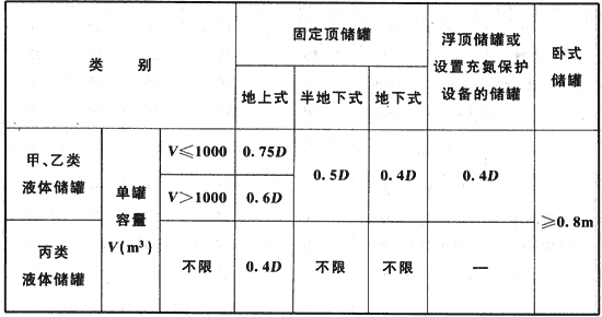 注:1D為相鄰較大立式儲罐的直徑(m),矩形儲罐的直徑為長邊與短邊之和的一半。