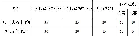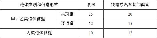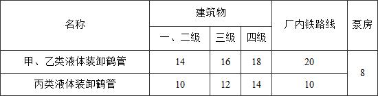 注:裝卸鶴管與其直接裝卸用的甲、乙、丙類液體裝卸鐵路線的防火間距不限。