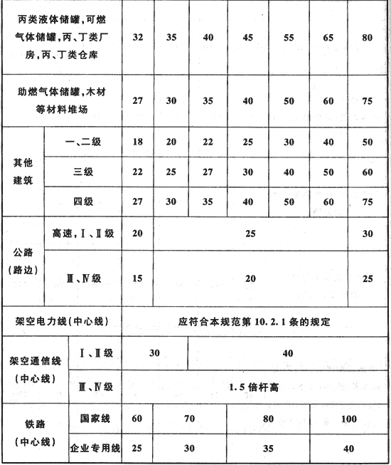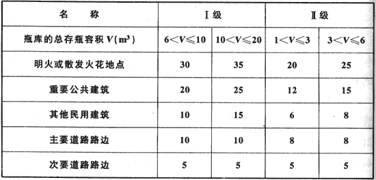 表4.4.5 Ⅰ、Ⅱ級(jí)瓶裝液化石油氣供應(yīng)站瓶庫(kù)與站外建筑等的防火間距(m)