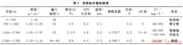 直井段采用低固相聚合物體系,膏鹽層段采用聚磺欠飽和一飽和鹽水體系,第3次開鉆井段采用聚磺體系。由于鹽層中高壓鹽水的存在,其存在又無規(guī)律,鹽水浸入又易導(dǎo)致鹽析發(fā)生卡鉆事故,現(xiàn)場(chǎng)試驗(yàn)地層破裂壓力系數(shù)在1.9g/cm3以上。因此,該井膏鹽層使用了比直井更高的鉆井液密度,目的是防止斜井段高壓鹽水浸和鹽層蠕動(dòng)變形。在膏鹽層段主要要提高鉆井液的潤(rùn)滑性,防止阻卡及降低鉆井液的流動(dòng)阻力,提高鉆井液的抗污染能力。有效避免鹽膏層的溶解、污染、縮徑、大井徑、井塌等一系列井下復(fù)雜和事故的發(fā)生,實(shí)際鉆井液性能,見表3。
