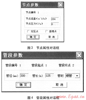 定義以管道為中心線且平行于管道的小面積矩形為線捕捉區(qū)域,以節(jié)點(diǎn)為圓心的小面積圓形為點(diǎn)捕捉區(qū)域,鼠標(biāo)在上述區(qū)域內(nèi)雙擊會(huì)分別彈出節(jié)點(diǎn)屬性和管段屬性對(duì)話框帕J,見(jiàn)圖3、4,為相應(yīng)的節(jié)點(diǎn)輸入流量或壓力,為相應(yīng)的管段輸入管長(zhǎng)、管徑、管材。對(duì)于多氣源管網(wǎng)還需輸入氣源屬性,程序通過(guò)節(jié)點(diǎn)編號(hào)重排使得壓力基準(zhǔn)點(diǎn)編號(hào)最大,定壓點(diǎn)隨基準(zhǔn)點(diǎn)居后編排,便于節(jié)點(diǎn)方程組的求解。點(diǎn)捕捉和線捕捉技術(shù)實(shí)現(xiàn)了管網(wǎng)圖和數(shù)據(jù)的緊密結(jié)合,更加直觀、形象,輸入大量管段和節(jié)點(diǎn)參數(shù)時(shí),很大程度上減少了輸入的差錯(cuò),提高了效率。