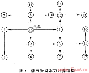 圖7為燃?xì)夤芫W(wǎng)水力計(jì)算結(jié)構(gòu),進(jìn)行水力計(jì)算后在Auto CAD中自動(dòng)輸出的水力計(jì)算結(jié)果標(biāo)注圖見(jiàn)圖8。