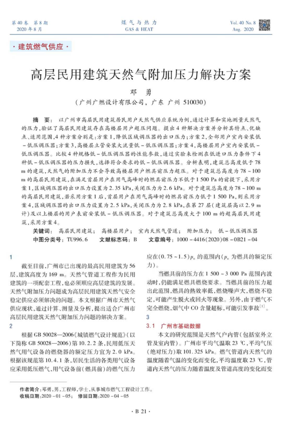 截至目前,廣州市已出現(xiàn)的最高民用建筑為56層,建筑高度為169 m。天然氣管道工程作為民用建筑的一項(xiàng)配套工程,也必須順應(yīng)高層建筑的發(fā)展。天然氣附加壓力問題成為高層民用建筑天然氣安全穩(wěn)定供應(yīng)必須解決的問題。本文根據(jù)廣州市天然氣供應(yīng)現(xiàn)狀,通過計(jì)算、測(cè)量及分析,提出適合廣州市高層民用建筑天然氣附加壓力問題的解決方案。