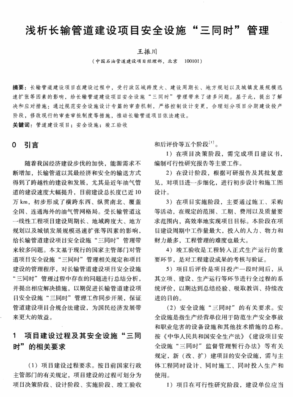 摘要:長(zhǎng)輸管遒建設(shè)項(xiàng)目在建設(shè)過程中,受行政區(qū)域跨度大、建設(shè)周期長(zhǎng)、地方規(guī)劃以及城鎮(zhèn)發(fā)展規(guī)模迅速擴(kuò)張等因素的影響,給長(zhǎng)輸管道建設(shè)項(xiàng)目安全設(shè)施“三同時(shí)”管理帶來了諸多問題?;诖?,提出了解決和應(yīng)對(duì)措施:通過規(guī)范安全設(shè)施設(shè)計(jì)專篇的審查機(jī)制,嚴(yán)格控制設(shè)計(jì)變更,合理劃分項(xiàng)目分期建設(shè)投產(chǎn)階段,修改現(xiàn)行的審查審批制度等措施,推動(dòng)長(zhǎng)輸管道項(xiàng)目依法建設(shè)。