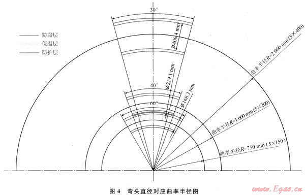 一般熱煨彎頭的曲率半徑為5DN,有時(shí)也為10DN,LG試采工程彎頭保溫部分工程熱煨彎彎頭的曲率半徑為5DN,彎頭保溫模具曲率半徑R保溫因此確定為5DN。彎頭直徑對(duì)應(yīng)曲率半徑如圖4所示。