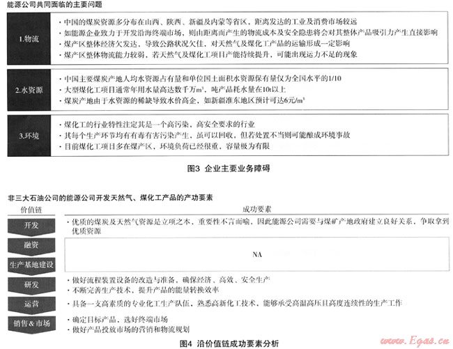 從目前情況來(lái)看,能源企業(yè)要開發(fā)非常規(guī)天然氣從事煤化工業(yè)務(wù)均需要消除以下障礙(圖3)。第一,物流:中國(guó)的煤炭資源多分布在山西、陜西,尤其是新疆及內(nèi)蒙等省區(qū),距離發(fā)達(dá)的工業(yè)及消費(fèi)市場(chǎng)較遠(yuǎn)。物流成本及運(yùn)輸安全隱患將會(huì)對(duì)企業(yè)運(yùn)營(yíng)產(chǎn)生直接影響。與此同時(shí),煤產(chǎn)區(qū)整體經(jīng)濟(jì)欠發(fā)達(dá),公路狀況欠佳,對(duì)天然氣及煤化工產(chǎn)品便利的運(yùn)輸也造成能源公司共同面臨的主要問題一定影響;第二,水資源:中國(guó)主要煤炭產(chǎn)地人均水資源占有量和單位國(guó)土面積水資源保有量?jī)H為全國(guó)平均水平的1/10,而大型煤化工項(xiàng)目通常年用水量高達(dá)數(shù)千萬(wàn)m3,噸產(chǎn)品耗水量在1Ot左右,供求關(guān)系的嚴(yán)重失衡,造成煤炭產(chǎn)地水價(jià)高企,如新疆某煤化工園區(qū)的水價(jià)預(yù)測(cè)可達(dá)6元/m3,對(duì)項(xiàng)目經(jīng)濟(jì)陛產(chǎn)生較大影響;第三,環(huán)境:煤化工的行業(yè)是高污染,高安全要求的行業(yè)。每個(gè)生產(chǎn)環(huán)節(jié)均有有毒有害污染物產(chǎn)生,如若處置不當(dāng)就可能釀成環(huán)境事故。目前煤化工項(xiàng)目多在煤產(chǎn)區(qū),環(huán)境負(fù)荷已經(jīng)很重,環(huán)境容量有限,若一哄而上以產(chǎn)能、產(chǎn)量為目標(biāo),則可能對(duì)環(huán)境造成無(wú)法挽回的影響。