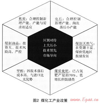 根據(jù)煤化工終端產(chǎn)品的不同,其重要性及配套政策也各不相同的。比如焦炭、電石及甲醇,因?yàn)樗鼈兌贾皇浅跫?jí)的煤化工產(chǎn)品,技術(shù)要求不高,產(chǎn)能已經(jīng)嚴(yán)重過剩,因此,合理控制新增產(chǎn)能,淘汰落后工藝就顯得尤為重要;而對(duì)于煤制氣,國(guó)家就采用了鼓勵(lì)政策,要求在資源豐富、煤價(jià)低的地區(qū)鼓勵(lì)發(fā)展;對(duì)于煤制油,因?yàn)槠渫顿Y需求巨大,技術(shù)風(fēng)險(xiǎn)相對(duì)較高,國(guó)家采取了嚴(yán)格監(jiān)管摸索前進(jìn)的方針(圖2)。