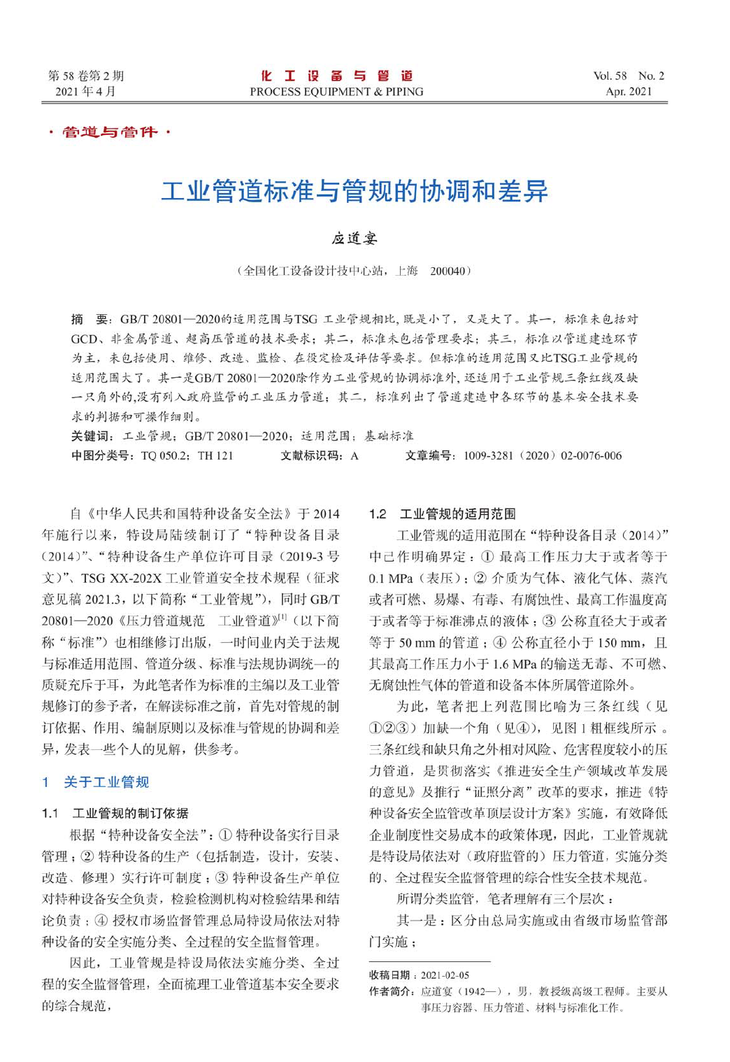 摘要: GB/T 20801-2020的適用范圍與TSG工業(yè)管規(guī)相比,既是小了,又是大了。其一,標(biāo)準(zhǔn)未包括對(duì)GCD、非金屬管道、超高壓管道的技術(shù)要求;其二,標(biāo)準(zhǔn)未包括管理要求;其三,標(biāo)準(zhǔn)以管道建造環(huán)節(jié)為主,未包括使用、維修、改造、監(jiān)檢、在役定檢及評(píng)估等要求。但標(biāo)準(zhǔn)的適用范圍又比TSG工業(yè)管規(guī)的適用范圍大了。其一是GB/T 20801- 2020除作為工業(yè)管規(guī)的協(xié)調(diào)標(biāo)準(zhǔn)外,還適用于工業(yè)管規(guī)三條紅線及缺一只角外的,沒有列入政府監(jiān)管的工業(yè)壓力管道;其二,標(biāo)準(zhǔn)列出了管道建造中各環(huán)節(jié)的基本安全技術(shù)要求的判據(jù)和可操作細(xì)則。