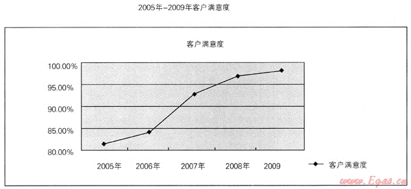 (2) 重慶燃?xì)饧瘓F(tuán)按照客戶滿意度測評表的項(xiàng)目和內(nèi)容進(jìn)行客戶滿意度測評,測評數(shù)據(jù)均由客服系統(tǒng)自動(dòng)生成。2005年-2009年客戶滿意度分別為:81.8%、84.3%、93%、97%、98.18%。