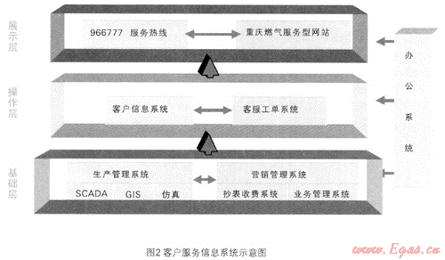 重慶燃?xì)饧瘓F(tuán)充分利用現(xiàn)代計(jì)算機(jī)和通訊技術(shù),創(chuàng)建了先進(jìn)的客戶服務(wù)信息系統(tǒng),包括生產(chǎn)管理、營銷管理、客戶資料、客戶服務(wù)工單、966777服務(wù)熱線五個(gè)方面,整個(gè)系統(tǒng)資源共享、無縫銜接,為客戶提供精細(xì)服務(wù)。服務(wù)流程是客戶服務(wù)工作的導(dǎo)向,為保證服務(wù)流程的統(tǒng)一,集團(tuán)公司通過建設(shè)客戶服務(wù)信息系統(tǒng),對服務(wù)流程進(jìn)行優(yōu)化,并在信息系統(tǒng)中對關(guān)鍵流程進(jìn)行固化。見圖2: