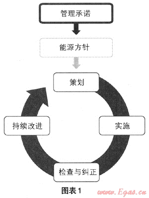 用能企業(yè)是實現(xiàn)能源節(jié)約的核心。在以節(jié)能減排為重要目標的指引下,企業(yè)使用任何能源,都應制定一個基本的控制程序,形成一個有效能源管理體系運行模式。企業(yè)為兌現(xiàn)管理承諾和實現(xiàn)能源方針應進行策劃-實施-檢查與糾正-持續(xù)改進(PDCA)等過程。圖示如下(圖表1):