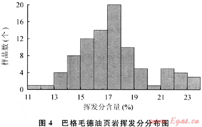 揮發(fā)分是油頁巖品質(zhì)好壞的一個(gè)重要指標(biāo),是指樣品在一定溫度條件下,隔絕空氣加熱一段時(shí)間,其有機(jī)質(zhì)分解放出的氣態(tài)有機(jī)質(zhì)即為揮發(fā)分。本次研究共對88件油頁巖樣品進(jìn)行了揮發(fā)分分析,研究結(jié)果表明,巴格毛德油頁巖樣品揮發(fā)分的分布范圍為12%~23.1%,平均值為17.4%,主要集中在15%~19%之間(圖4)。