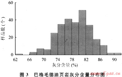 共分析油頁巖灰分樣品88個(gè),灰分含量分布范圍為63.1%~83.9%.,平均值為74.8%,主要集中在74%~84%之間,屬于中灰分油頁巖(圖3)。