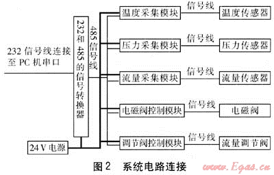 電路設計要根據測試系統(tǒng)中所選用的儀器儀表來進行。溫度測量采用德國原產溫度傳感器與變送器,Pt100精度等級1/3B,4線制;溫度測量范圍為0~150℃,具有響應時間短、測量精度高等特點,輸出信號4~20mA。流量測量采用德國原產ProcessMaster系列電磁流量計、五點標定后精度為0.2%。電磁流量計根據法拉第電磁感應定律設計,流量正比于介質流速和磁通密度,以及電極間的距離。電壓信號用變送器轉換成標準信號,方便數據采集,而且電磁流量計無節(jié)流部件,壓力損失小,減少能耗,只與被測流體的平均速度有關,測量范圍寬。只需經水標定后即可測量其他介質,無須修正,相比于浮子流量計精度大大提高。壓力測量采用德國原產壓力傳感器,測壓范圍為0~3MPa,精度為0.15%,輸出標準電流信號。燃氣消耗量測量采用日本品川濕式氣體流量計,既可以通過流量計的機械表盤讀取燃氣消耗量,也可以通過其發(fā)出的電信號經過處理后得到燃氣消耗量。燃氣壓力測量用壓力表量程為0~5kPa,輸出相應的電信號進行數據采集。流量調節(jié)閥選用電動調節(jié)閥,進行遠程控制。煙氣分析儀采用多組分煙氣分析儀,各組分都有對應的電信號輸出。數據采集模塊選用ADAM系列模塊對各參數進行高精度采集與控制。系統(tǒng)電路連接見圖2。