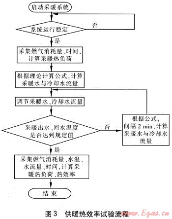 為了進一步說明系統(tǒng)軟件設計過程,下面以供暖性能試驗中的供暖熱效率試驗為例加以詳細闡述。該試驗過程需要采集的數據有供暖出水溫度、供暖回水溫度、供暖水流量、燃氣消耗量、時間等,要控制冷卻水流量、供暖水流量。試驗控制流程見圖3。