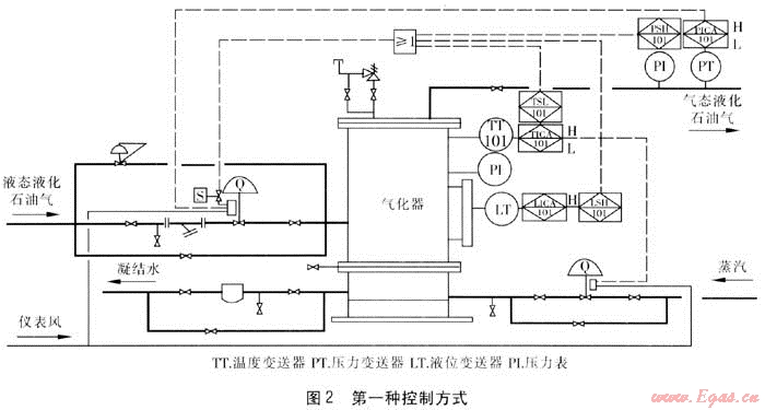 氣化器的控制方式比較靈活,實(shí)際生產(chǎn)中往往要根據(jù)現(xiàn)場的工況、氣化量、用途及性價比等因素綜合考慮,總之,系統(tǒng)要具有較強(qiáng)的抗干擾能力,應(yīng)易于擴(kuò)展,對于安全性要求較高的場合應(yīng)本著滿足故障安全的設(shè)計原則。本文討論2種控制方式,分別見圖2和圖3。圖3的圖例同圖2。