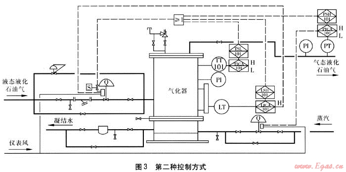 第二種控制方式是用氣化器的出氣壓力控制蒸汽調(diào)節(jié)閥的開度,用液位控制進(jìn)液調(diào)節(jié)閥的開度。同樣,對氣化器設(shè)置液位高限、出氣溫度低限和出氣壓力高限,當(dāng)出現(xiàn)任何一個或多個限值時切斷氣化器進(jìn)液調(diào)節(jié)閥。