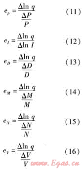 根據(jù)式(9)對居民生活用氣量指標(biāo)進(jìn)行彈性分析。彈性分析的目的在于得到居民生活用氣量指標(biāo)對其影響因素的微小變化所做出的反應(yīng)。居民生活用氣量指標(biāo)相對各項(xiàng)影響因素的彈性如下: