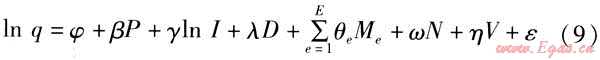 其中,P、I、D、V反映連續(xù)變量對居民生活燃?xì)庀牧康挠绊?,為?shí)際數(shù)值;Me、N是為反映定性變量對居民生活燃?xì)庀牧康挠绊懚摌?gòu)的數(shù)值,稱為虛擬變量(例如:擁有第e種燃?xì)庠O(shè)備,則Me=1,否則Me=0;用戶燃?xì)馐褂昧?xí)慣為寬松型,則N=1,否則N=0)。