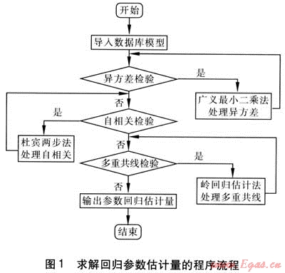 根據(jù)橫截面數(shù)據(jù)樣本,采用最小二乘法對式(9)進(jìn)行參數(shù)估計(jì),得到滿足經(jīng)典回歸假設(shè)檢驗(yàn)的回歸參數(shù)。求解回歸參數(shù)估計(jì)量程序流程見圖1。