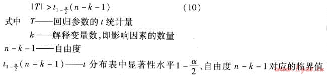 對求得的回歸參數(shù)進(jìn)行t檢驗(yàn),若回歸參數(shù)的t統(tǒng)計(jì)量滿足式(10),則認(rèn)為此回歸參數(shù)對應(yīng)的項(xiàng)目對居民生活年燃?xì)庀牧縬有顯著影響,否則認(rèn)為影響不顯著。