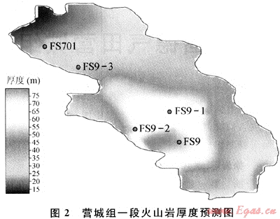 3) 屬性模型。研究區(qū)屬性建模采用測井曲線生成法,利用井筒巖石密度曲線數(shù)據(jù)建立密度模型[4]。由于火山巖與圍巖的區(qū)分十分復雜,單一屬性不能很好描述儲層分布[5],所以采用巖石密度和伽馬曲線這兩種對火山巖儲層較敏感參數(shù)進行建模,所以本區(qū)建立了密度和伽馬模型,并根據(jù)有效厚度劃分標準,預測了營城組一段有效厚度分布。本次建模過程中將密度曲線粗化后,進行變差函數(shù)分析,正確的變異函數(shù)估計要求對采樣方式、均值變化或樣品承載大小以及變異函數(shù)對方位變化的敏感性作出全面的評價。然后用密度反演體作為協(xié)變量,進行10次隨機實現(xiàn)[6~7]。圖2為通過昌德氣田的密度屬性模型得出的營一段儲層厚度預測圖,F(xiàn)S9區(qū)塊發(fā)育一個經過FS701、FS9-1、FS9井的北西向火山巖條帶。