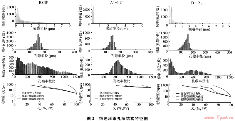 多數樣品孔隙半徑小于0.1μm,為微孔喉,占54.04%,大于0.5μm的為大孔喉僅為7.52%,0.1~0.5μm之間的為中小孔喉占38.44%,表明該區(qū)儲層孔隙半徑以微孔喉為主,孔隙結構有5種形式,儲層主要為Ⅰ、Ⅱ、Ⅲ類;火山巖儲層巖心排驅壓力平均為7.63MPa,其中排驅壓力較小聲d<1MPa的樣品占17.55%,pd在1~5MPa的樣品占47.35%,最大汞飽和度平均為68.14%,剩余汞飽和度平均49.34%,退出效率為36.22%,反映研究區(qū)連通性好的樣品比例較低,孔喉比較大,連通孔隙的平均孔喉少,孔隙大小的均一程度較差,表明巖心中孔隙與喉道的尺寸大小不均勻(圖1)[4]。
