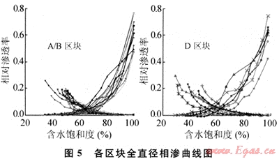 反映儲層為親水巖石,呈兩相流特征,束縛水飽和度高,兩相滲流范圍小,氣驅水效率低。A區(qū)塊可流動氣飽和度區(qū)間為0~65.62%;束縛水飽和度34.38%~51%,兩相滲流范圍比較大,為49%~65.62%。B區(qū)塊可流動氣飽和度區(qū)間為0~70.28%;束縛水飽和度29.72%~49.81%,兩相滲流范圍比較大,為55%~69.5%(圖5)。