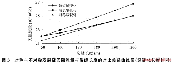 根據不對稱裂縫產能模型,分別計算了壓裂不對稱單裂縫與雙裂縫氣井的產能,從圖3可以看出,隨著裂縫長度的增加,裂縫控制的泄氣面積不斷增大,壓裂不對稱單裂縫與雙裂縫氣井的產能均不斷增加,但是隨長軸變化下的無阻流量增加的幅度要大一些。
