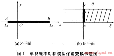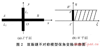 如圖1所示,采用保角變換函數將Z平面上建立的x-y不對稱裂縫坐標系轉化為W平面車ε-η坐標系,可用于描述儲層不對稱裂縫的流動形態(tài)對壓裂后產能的貢獻。