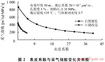 從模擬看(圖2),壓裂井表皮系數(shù)在0.3時(shí),采氣指數(shù)與零表皮對(duì)比下降幅度在10%左右,由于壓裂井表皮系數(shù)普遍較低,因此表皮系數(shù)對(duì)壓裂井產(chǎn)能影響較小。射孔完井的井表皮系數(shù)一般較高,因此表皮系數(shù)對(duì)產(chǎn)能的影響較大,如果表皮系數(shù)達(dá)到20,則采氣指數(shù)與表皮系數(shù)為0時(shí)的對(duì)比下降幅度達(dá)到68%。有些射孔完井的井在試采中產(chǎn)量與壓力保持穩(wěn)定,關(guān)井后壓力恢復(fù)程度高,恢復(fù)速度快,但采氣指數(shù)并不高,與表皮系數(shù)的影響有很大關(guān)系。