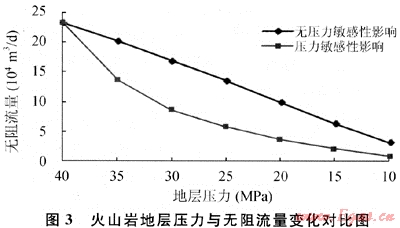 巖心實(shí)驗(yàn)表明,火山巖儲(chǔ)層具有很強(qiáng)的壓力敏感性。以實(shí)驗(yàn)數(shù)據(jù)為基礎(chǔ)數(shù)據(jù),假定儲(chǔ)層有效厚度50m,流動(dòng)半徑700m,未考慮壓裂改造影響,采用擬穩(wěn)態(tài)氣井產(chǎn)能公式,分別計(jì)算了無壓敏影響和有壓敏影響下的氣井產(chǎn)能變化情況,從計(jì)算結(jié)果看(圖3),在考慮壓敏影響下隨著地層壓力的下降,氣井產(chǎn)能與無壓敏影響下的產(chǎn)能有較大的差距,最高損失達(dá)到70%。