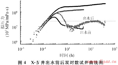 由于啟動(dòng)壓力梯度的影響,許多井試井解釋出的邊界可能就是這種由于存在著啟動(dòng)壓力梯度現(xiàn)象而導(dǎo)致的高低滲透層之間的不流動(dòng)邊界。在實(shí)際的開發(fā)中,隨著時(shí)間的延續(xù),流動(dòng)區(qū)域地層壓力的下降,原來未動(dòng)用的低滲區(qū)域可以得到動(dòng)用。從試采時(shí)間較長的X-Ⅲ井的一年半時(shí)間內(nèi)的先后兩次關(guān)井壓力恢復(fù)試井解釋看,存在著流動(dòng)區(qū)域擴(kuò)大的趨勢(shì),解釋的流動(dòng)區(qū)域的范圍擴(kuò)大了40m左右。