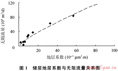 試采表明,氣井產(chǎn)能與可流動(dòng)區(qū)域的地層系數(shù)具有一定的相關(guān)性,氣井的無阻流量隨著地層系數(shù)的增加而增大(圖1)。同樣儲(chǔ)層有效流動(dòng)區(qū)域的過膜也影響到氣井的產(chǎn)能,規(guī)模越大,單位壓降下的采氣量也就越高。