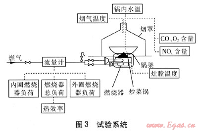為研究負(fù)荷、鍋架相對(duì)高度(鍋架頂部距外圈燃燒器頂部的距離)、鍋架開(kāi)口寬度對(duì)熱效率及煙氣的影響,筆者在采用節(jié)能環(huán)保型燃燒器基礎(chǔ)上,進(jìn)行了一系列試驗(yàn)研究。試驗(yàn)用氣源為天然氣,壓力為2kPa。以三眼中餐炒菜灶作為試驗(yàn)灶具,其單個(gè)燃燒器負(fù)荷為30kW,采用尖底炒菜鍋。試驗(yàn)系統(tǒng)見(jiàn)圖3。