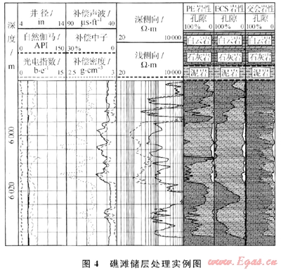 對于碳酸鹽巖儲層,儲層的巖石組分主要為白云巖和石灰?guī)r,一般用三孔隙度曲線(中子、聲波、密度)中任意兩條曲線交會進行求解。但是,在天然氣層,由于受到天然氣的影響,中子和密度測井值偏低而聲波時差測井值偏高,導致計算的巖石組分含量不準確。在目前的測井系列中,斯倫貝謝的ECS測井可計算出比較準確的巖石組分含量,但價格昂貴;而光電吸收截面指數(shù)(PE)受儲層孔隙流體類型的影響小,而且價格低廉,所以可應用于計算地層的巖石組分含量。圖4為川中某構造礁灘儲層不同測井方法計算巖性剖面對比圖,從圖上可見,光電吸收截面指數(shù)(PE)計算的巖性剖面與元素俘獲測井(ECS)處理的巖性剖面具有很好的一致性,而交會法計算的巖性剖面與ECS處理剖面一致性較差。所以,對于井眼狀況相對較好的碳酸鹽巖儲層,一般可測到高質量的PE曲線,可應用PE曲線確定巖石組分含量,再計算孔隙度等其他參數(shù),體現(xiàn)了本軟件在計算碳酸鹽巖儲層組分含量的優(yōu)越性。