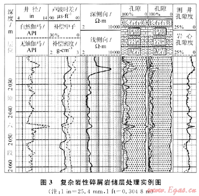 復雜巖性碳酸鹽巖儲層處理模塊是在雙礦物解釋程序發(fā)展起來的一個處理模塊,它考慮了中子曲線的含氣校正、聲波時差與孔隙度的非線性關系、巖性三角形的非正規(guī)排列等多個因素,使其更適用于一般碳酸鹽巖儲層的處理。