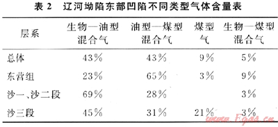 上式中V油、V煤分別代表混合氣中偏陸源油型氣和煤型氣的含量百分?jǐn)?shù)。通過公式可計(jì)算得出東部凹陷不同層段的天然氣的混合比例(表2)。總體上,以生物-油型混合氣和油型-煤型混合氣為主,各占43%,煤型氣和生物~煤型混合氣含量較少,分別占總體的9%和5%。東營組以油型煤型混合氣為主,占到東營組的65%,沙一段和沙二段以生物-油型混合氣為主體,占沙一段、沙二段樣品的69%;沙三段幾種類型天然氣都占有一定的比例,相對其他的層段,煤型氣的含量有所上升,達(dá)到21%。