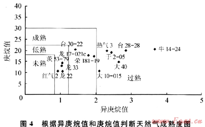 將據(jù)該區(qū)異庚烷值和庚烷值判斷的天然氣成熟度(圖4)同據(jù)苯與甲苯含量確定的天然氣成熟度進(jìn)行比較,二者非常一致,說明該區(qū)天然氣以低熟-成熟為主,在牛14-24井及大40、熱氣3井天然氣的成熟度較高,均達(dá)到了過熟階段。