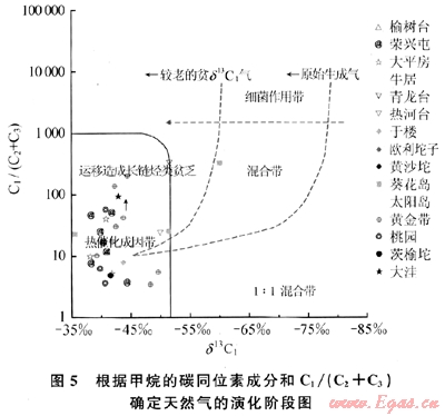 依據(jù)國內(nèi)外文獻(xiàn)資料[2~4,14~19],該區(qū)天然氣的演化階段劃分為生物成因氣、熱催化過渡帶氣、熱解氣、裂解氣4個(gè)階段。應(yīng)用乙烷和甲烷碳同位素分析,看出該區(qū)存在著大量的混源氣。混源氣具有乙烷碳同位素較重,而甲烷碳同位素較輕的特征,例如黃金帶、熱河臺、榮興屯可能均存在著生物成因氣與熱解氣的混源。