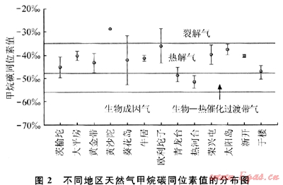 該區(qū)天然氣的碳同位素以-42‰占優(yōu)勢,甲烷碳同位素分布的主要范圍為-35‰~-55‰。按不同的地區(qū)對甲烷同位素值進(jìn)行統(tǒng)計(jì),可知各個(gè)地區(qū)天然氣的甲烷碳同位素值主要處于熱解氣階段(圖2)。在于樓、熱河臺和青龍臺地區(qū)碳同位素值相對較輕,可能混有生物-熱催化過渡帶氣。而在歐利坨子、黃沙坨地區(qū)發(fā)現(xiàn)了較重甲烷碳同位素值的天然氣,可能是裂解成因或混有煤型天然氣有關(guān)。