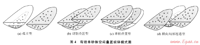 ①孤立型——與單個心灘的規(guī)模相當,厚度主要2~6m,寬度400~800m,長度900~1200m;②切割疊置型——辮狀河復合河道內(nèi)可形成2~3個心灘切割疊置,復合砂體厚度5~10m,寬度500~1200m,長度800~1500m;③堆積疊置型——辮狀河復合河道內(nèi)多個有效砂體堆積疊置,但切割作用弱,砂體間有物性隔層,復合砂體規(guī)模與切割疊置型基本一致;④橫向局部連通型——河床滯留粗砂巖連接多個心灘,可形成分布范圍更大的復合有效砂體。