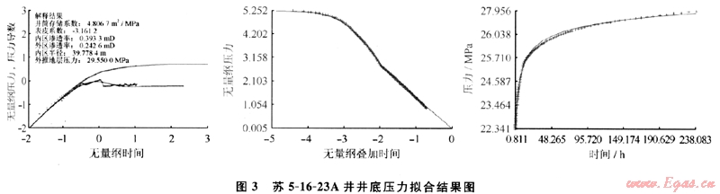 最終得到了該井表皮系數(shù)為-3.16,說(shuō)明是壓裂后受效井,表皮系數(shù)較??;分析該井地層模型為復(fù)合地層,內(nèi)區(qū)滲透率為0.39mD,內(nèi)區(qū)半徑為39.7m,說(shuō)明近井地帶40m左右是壓裂后滲透性改善區(qū);而外區(qū)滲透率0.2426mD,說(shuō)明壓裂縫外圍地層的滲透情況。