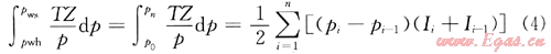 對(duì)式(2)的右邊進(jìn)行數(shù)值積分,把(pws,pwh)段平均分作n個(gè)壓力段(pi-1,pi){i=1,2,3,…,n;p0=pwh,pn=pws),并使每個(gè)壓力段的步長(zhǎng)足夠小,則有: